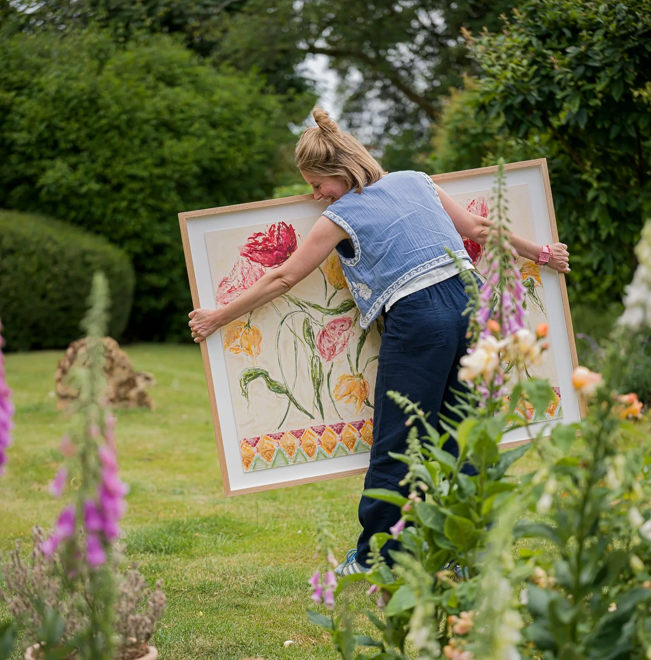 Rachel’s works are held in private collections internationally and in the UK, including the Royal Collection of the British Royal Family. Her paintings can also be found in public spaces such as Socca restaurant, Mayfair, and previously at Edward Bulmer Natural Paint, where she featured as a guest artist. Brand partnerships include Smythson and Sharland England, and her work has been featured in Sheerluxe, BBC Countryfile and Country Living, who described Rachel’s paintings as ‘a feast of colour and pattern’.